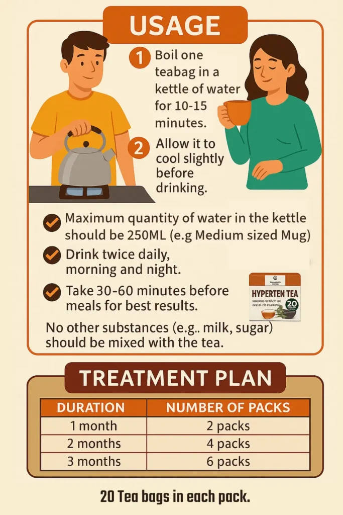 A Pack of HYPERTEN TEA is made up of 20 potent Tea Bags which contains a unique blend of powerful antihypertensive herbs, carefully sourced both locally and internationally, crafted using advanced herbal processing methods and formulated for daily use – morning and night for optimal action. To ensure even better results, we’ve introduced a structured treatment plan;